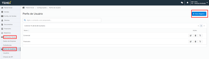 No menu lateral esquerdo da sua conta Tenex, siga o caminho: Definições Gerais > Perfis de Usuários > + Novo Registro