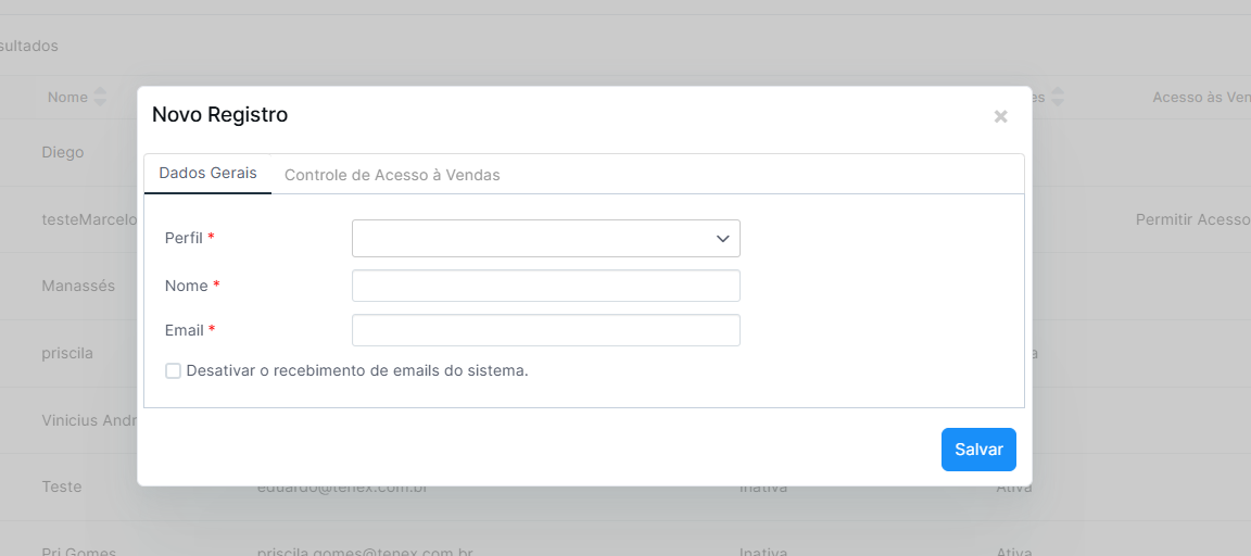 Notificações (Opcional): Marque a caixa "Desativar o recebimento de e-mails do sistema" apenas se desejar que este usuário não receba alertas automáticos da plataforma.