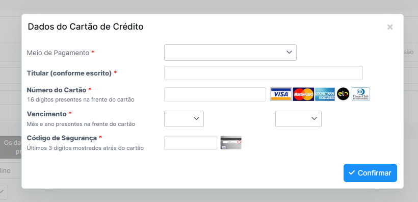 Processamento Imediato: Para que o pagamento seja processado no ato da configuração, mantenha a Data de Vencimento para o mesmo dia da emissão. Assim que o cartão for validado, o sistema tentará a captura junto à operadora.