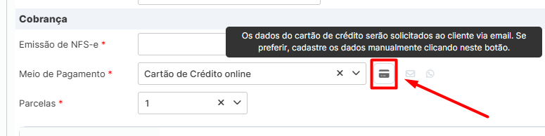 Dica Pro: Se você já tiver os dados do cartão do cliente, insira-os diretamente no botão de destaque. Caso contrário, marque a opção "Enviar cobrança por E-mail". Assim, o cliente recebe a fatura online e cadastra os próprios dados com segurança.