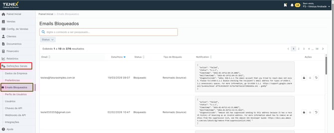 Menu lateral > Definições Gerais > E-mails Bloqueados